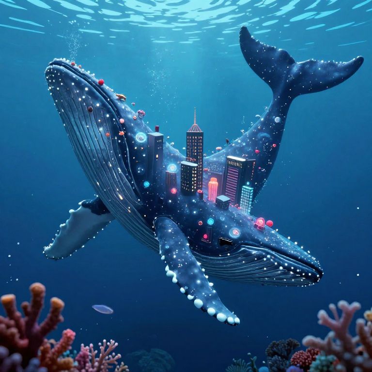 A digital artwork depicts a massive blue whale adorned with a cityscape of illuminated skyscrapers on its back. The whale, with intricate white line patterns and bioluminescent spots, swims gracefully in a deep blue underwater environment. Above, light filters through the water's surface, creating a shimmering effect. In the foreground, colorful coral reefs add contrast to the scene. Bubbles and small fish are scattered around, enhancing the underwater atmosphere. The whale's tail and fins are prominently curved, while the city lights glow in shades of red, blue, and yellow.