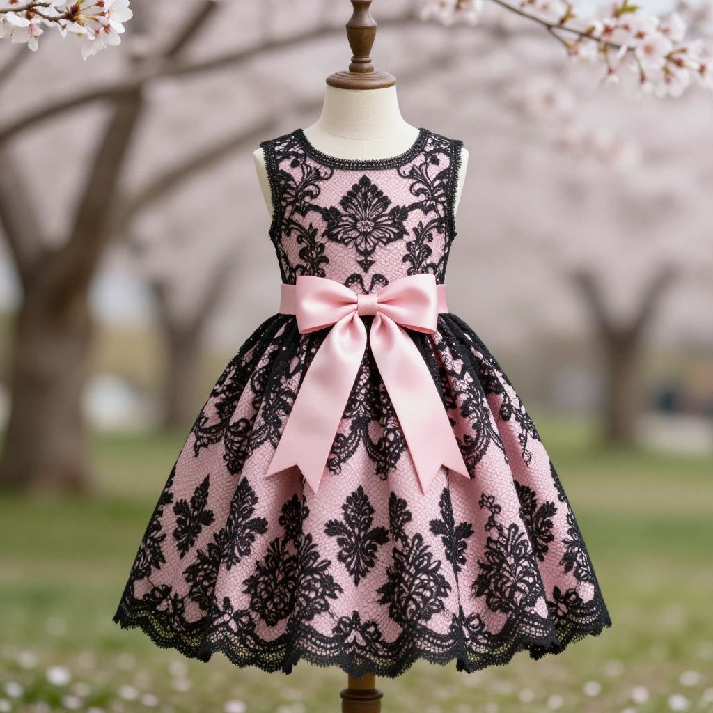 Photograph of a black lace long-sleeve dress with a voluminous tulle skirt, red satin ribbon, displayed on a mannequin;
