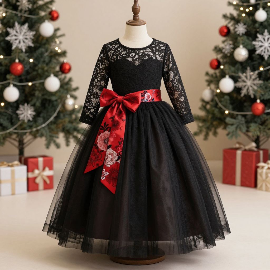 Elegant black long-sleeve lace princess dress featuring a vibrant red floral sash and sheer tulle skirt, perfect for festive holiday occasions.