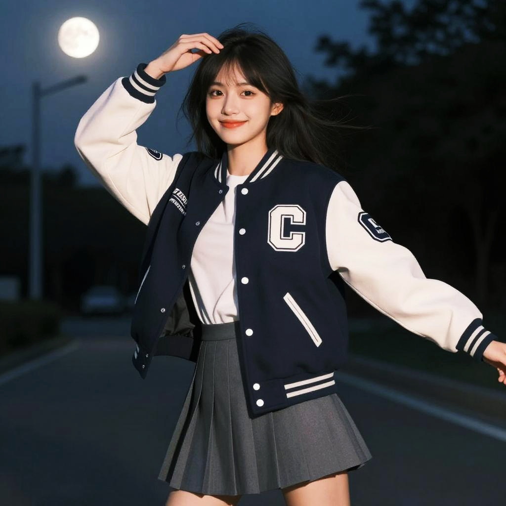 1girl, smile, stylish outfit, pleated skirt, (Letterman Varsity Jacket), (realistic detailed eyes, natural skin texture, confident expression), in the road, outdoors, moonlight, dynamic composition, engaging pose, soft yet striking lighting, shallow depth of field, sharp details, highly detailed, hyper-realistic, 50mm lens, naturally blurred background.