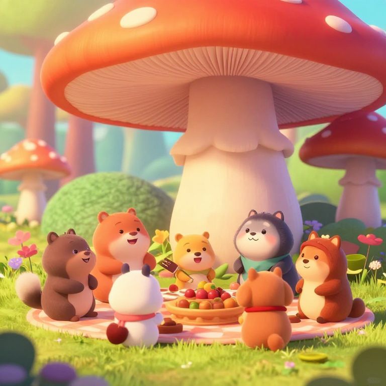 Pixar style art featuring a playful group of forest animals having a picnic under a giant mushroom, rendered with smooth shading, exaggerated proportions, and vibrant, pastel color palette, conveying joy, innocence, and magical realism.