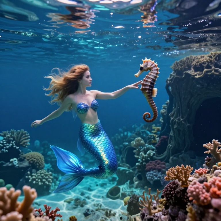 From an enchanting perspective hovering above the water's surface, behold a mesmerizing dance between a graceful mermaid adorned in shimmering iridescent blue scales and a captivating seahorse entwined around her finger. Ethereal light filters through the depths, casting vibrant hues across their intertwined forms, evoking tranquility and wonder as they glide gracefully through an underwater realm of coral gardens and mysterious caverns. The viewer is invited to lose themselves in this enchanting marine tableau, capturing the delicate beauty of nature's hidden wonders.