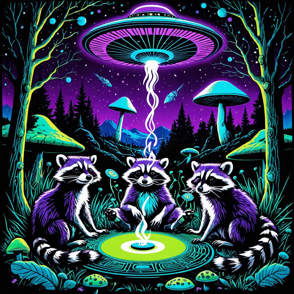 Vintage 70s black light poster of funky raccoons, smoking joints, alien landscape, UFO flying saucers, psilocybin cubensis mushrooms, vibrant trippy colors, electric purple and lime, labyrinthine cosmic webs