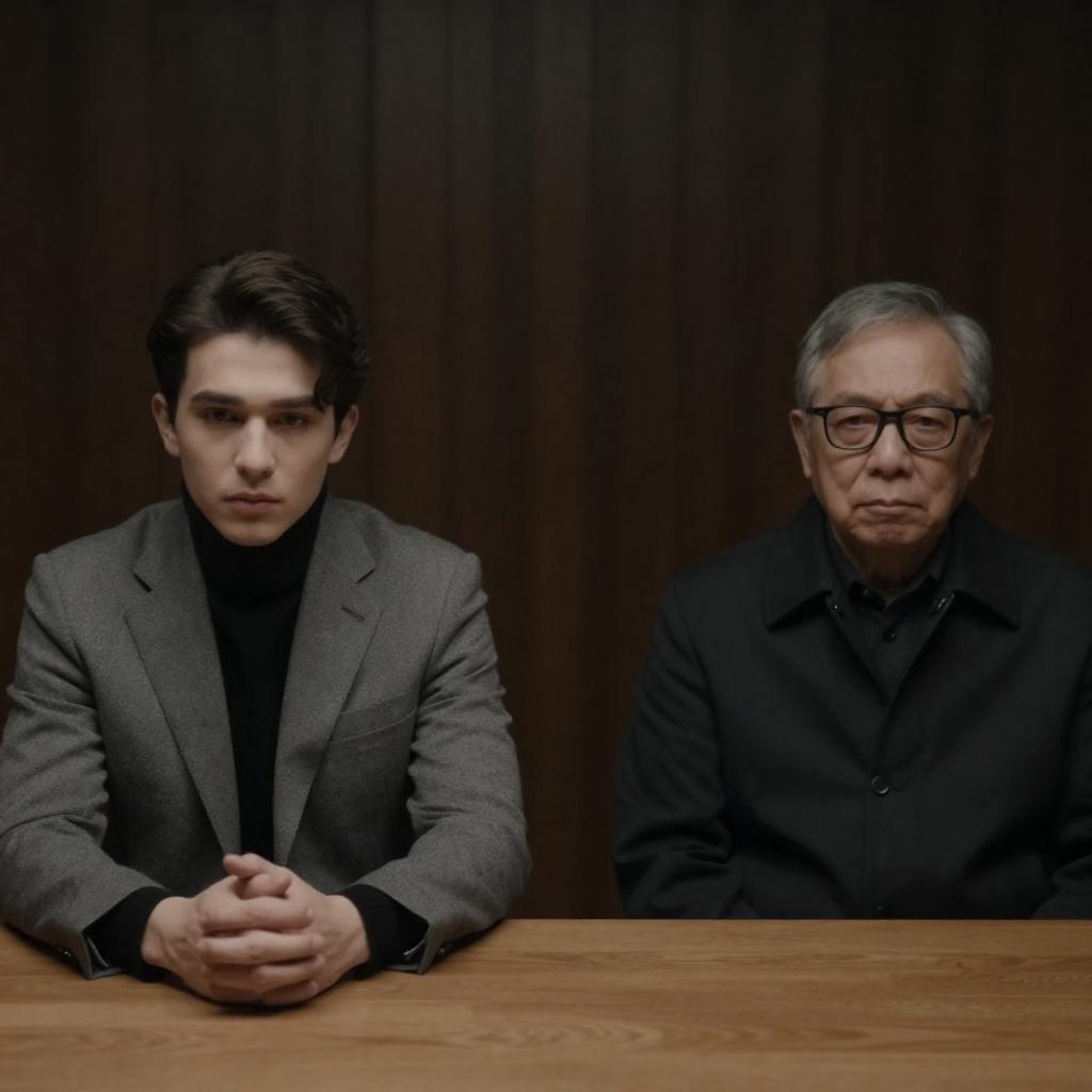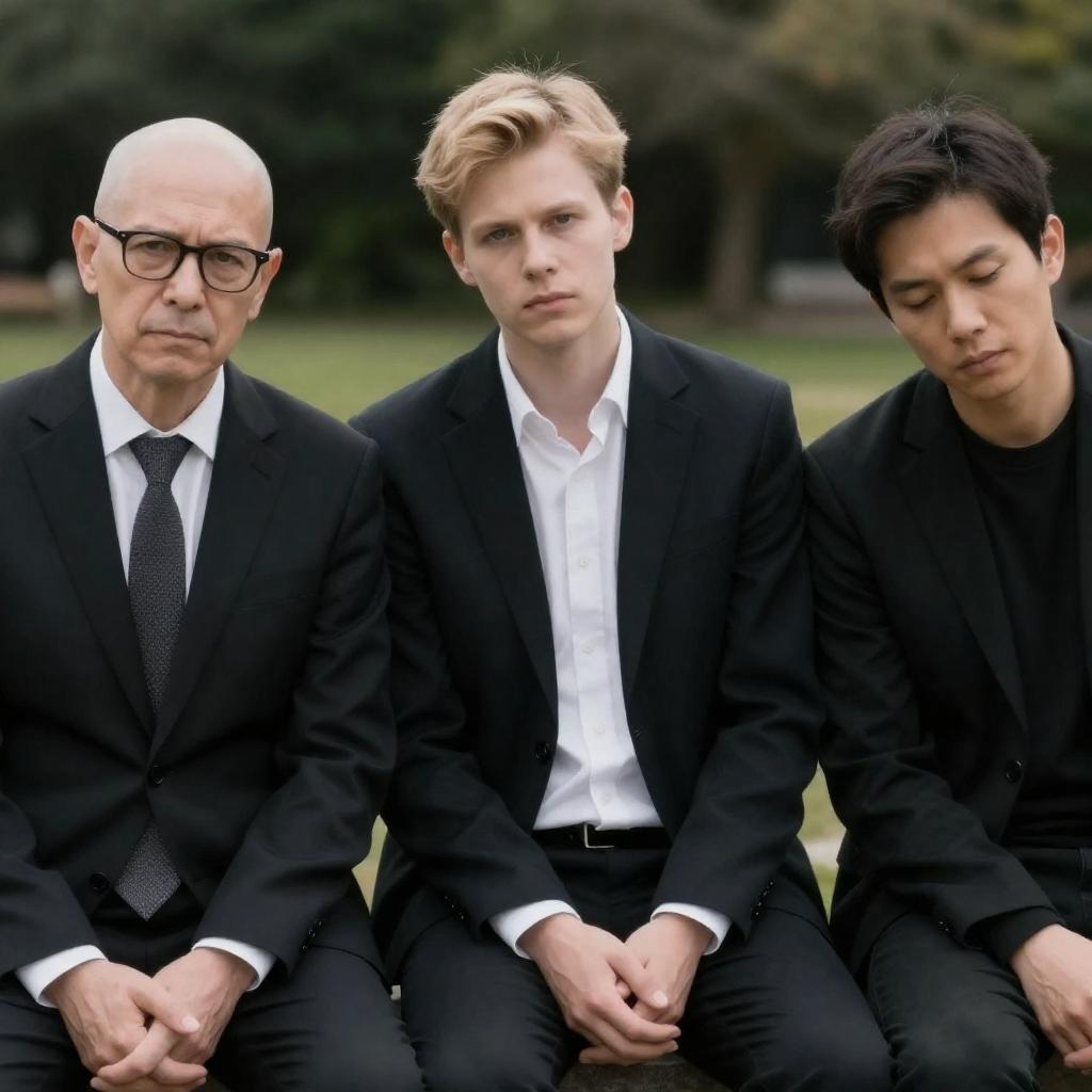 Three men sitting outdoors, blurred greenery background. Bald man in black suit and tie, glasses, serious expression. Middle man with blonde hair, white shirt, black jacket, intense gaze. Man on right, dark hair, black clothing, looking down.