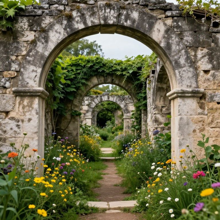 Photograph of a picturesque, overgrown stone archway garden. The arch, made of aged, weathered stones, is adorned with creeping ivy. A narrow, brick path leads through the arch, flanked by vibrant, colorful wildflowers, including yellows, reds, purples, and whites. The background shows multiple arches receding into a lush, green garden, with sunlight filtering through the foliage. The texture of the stone arch contrasts with the soft, blooming flowers and greenery, creating a serene, enchanting atmosphere.