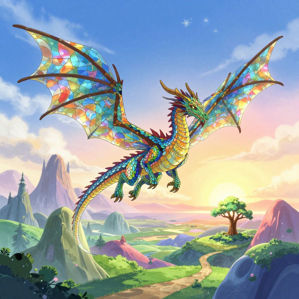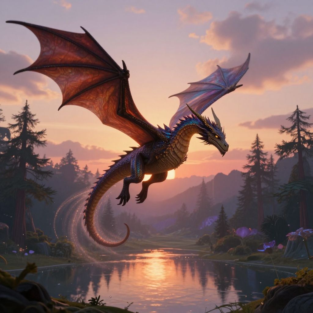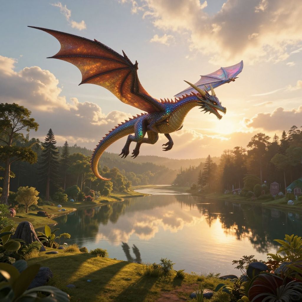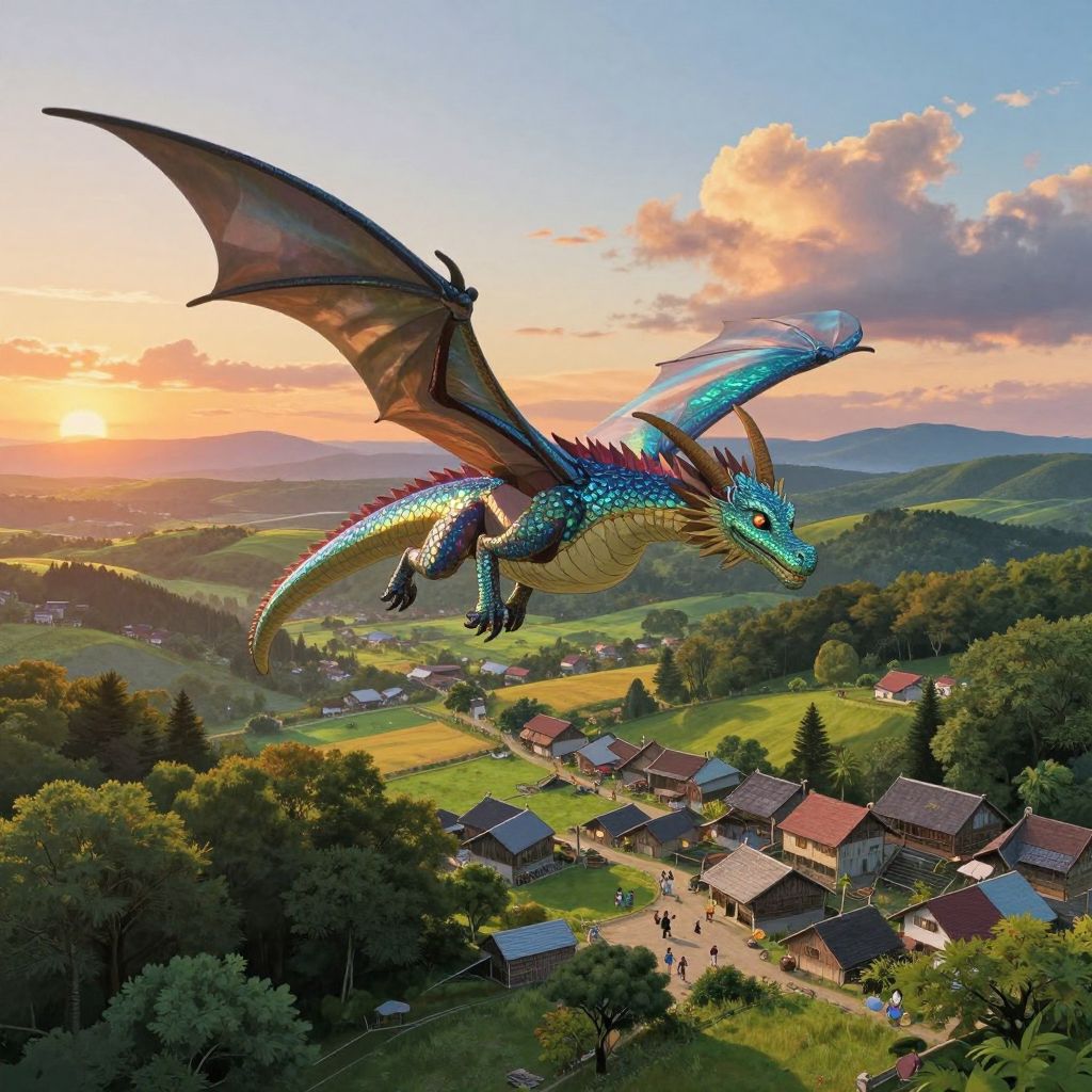 An awe-inspiring digital artwork portraying an elegant dragon soaring above a sprawling, vibrant landscape during sunset, reminiscent of Studio Ghibli's enchanting animations. The dragon's scales shimmer with iridescence as it gracefully arcs through the sky, its wings spreading like sails filled with wind. In the background, a quaint village nestled among rolling hills and lush forests becomes visible, with tiny figures carrying on their daily routines, unaware of the magnificent creature above them. This scene, captured from an aerial perspective that showcases the grandeur of both dragon and scenery, evokes a sense of wonder combined with gentle nostalgia for the simplicity of life below.