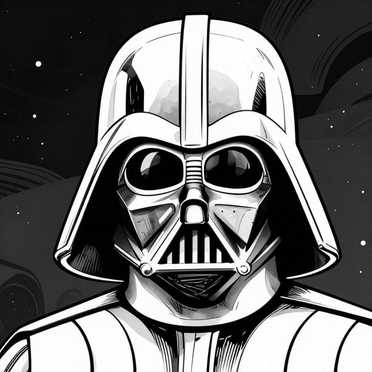 Black-and-white digital drawing of Darth Vader's head in a bold, comic-book style with stark contrasts, against a starry night background.