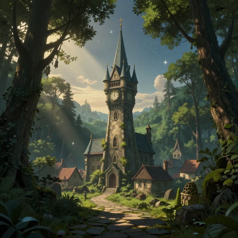 Envision an otherworldly digital artwork depicting an enigmatic old tower soaring above a charming village situated in the bosom of a mystical forest. The edifice stands at the threshold of a glade, its worn spires yearning towards the star-studded expanse. As daybreak draws near, the initial beams of sunlight pierce the verdant canopy, projecting elongated silhouettes across the lichen-coated flagstones and highlighting the delicate engravings that embellish the tower's exterior. This scene encapsulates a captivating fusion of fancifulness and wistfulness as the clock's tolls reverberate through the serene panorama, invoking a sense of perpetuity and awe while hinting at concealed stories nestled within its storied walls.