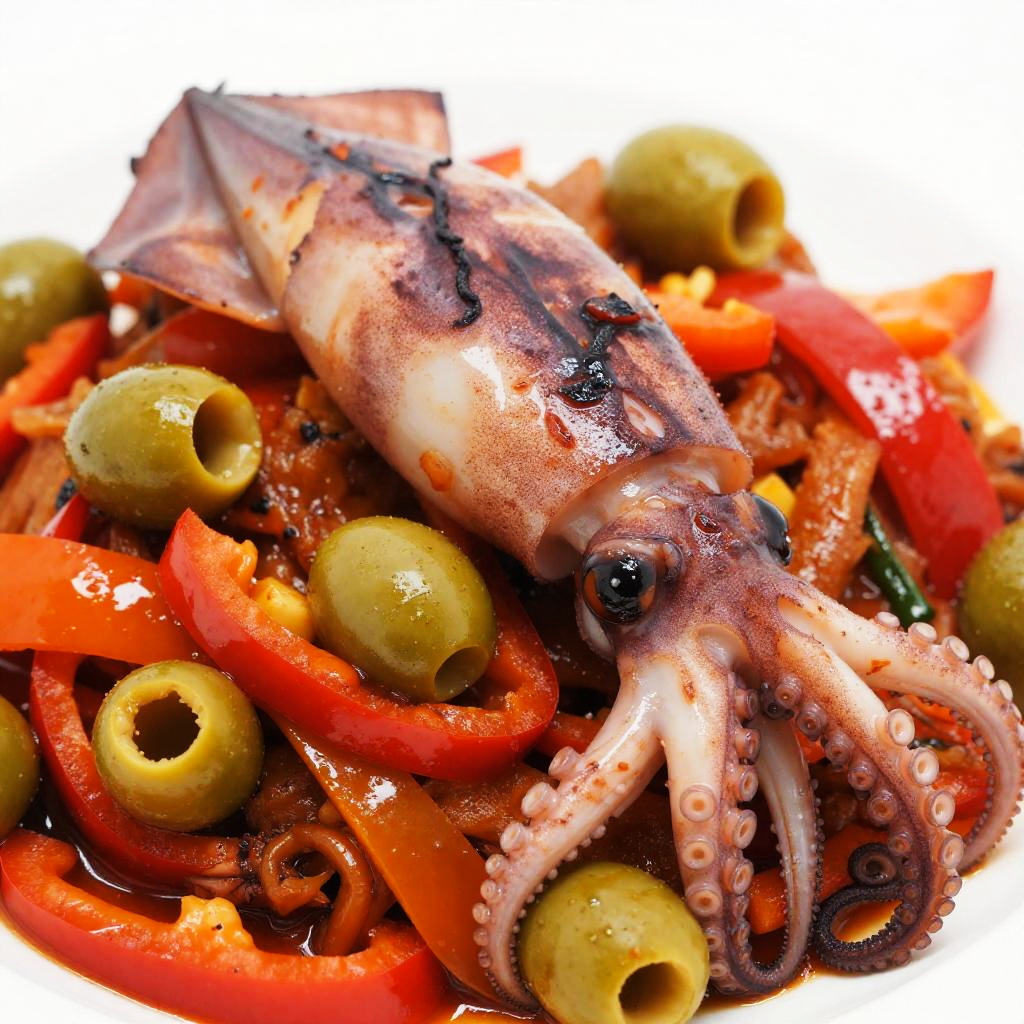 This close-up photo features a colorful, spicy dish with a large, deep-red, tentacled squid partially covered in a vibrant mix of red bell peppers, green olives, and orange peppers. The squid's texture is glossy and slightly charred, with visible suction cups. The background is a bright white, making the vivid colors of the ingredients pop. The overall presentation is hearty and appetizing.