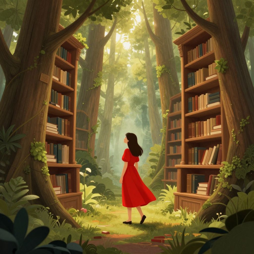 A serene digital illustration depicts a young woman in a vibrant red dress exploring a mystical library nestled within a lush forest, where towering trees seamlessly blend with wooden bookshelves filled with living books, bathed in the soft, ethereal light of golden hour.