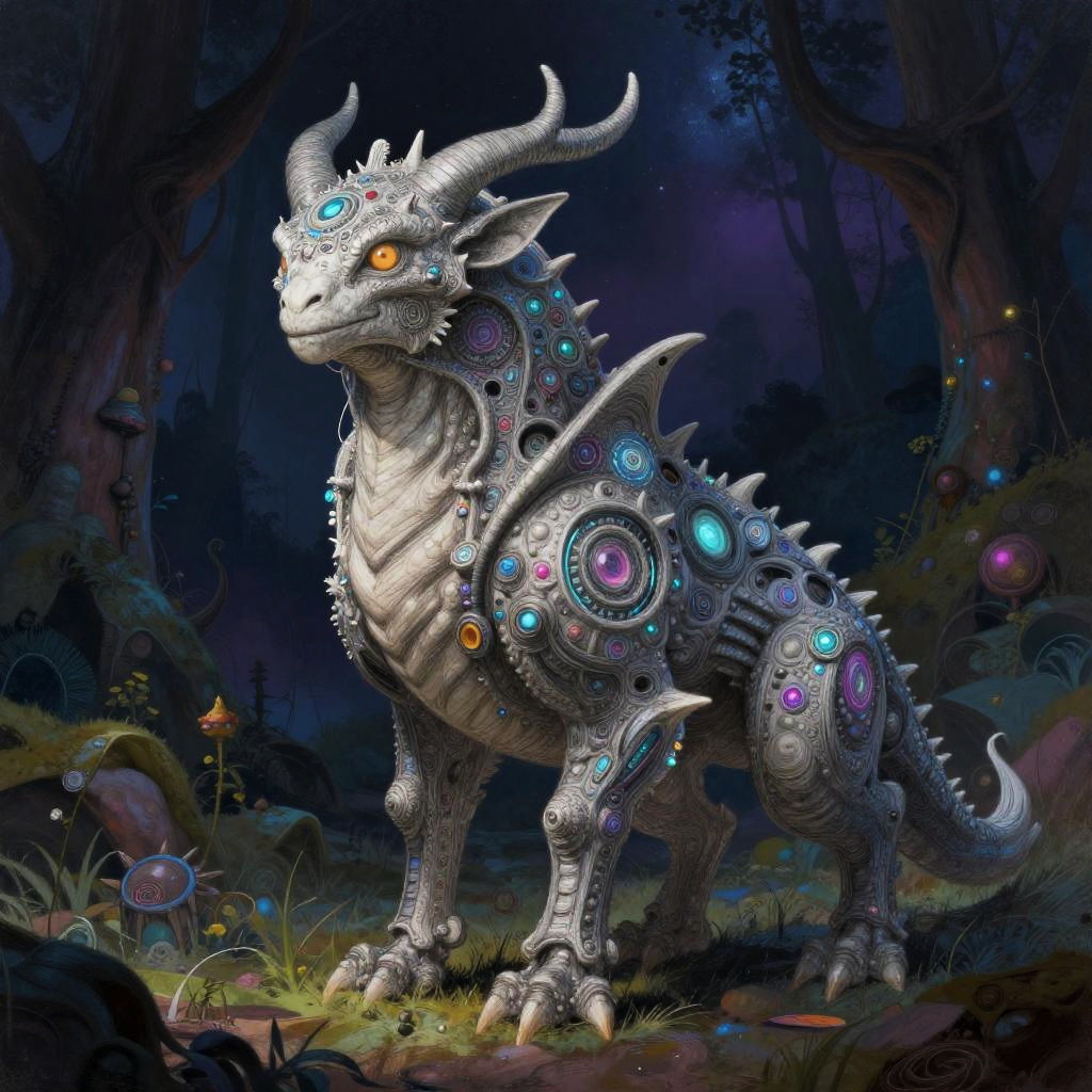Drawing ai generator producing an imaginative fantasy creature, detailed pencil sketch merging with colorful digital painting, blending organic textures with glowing cyber elements, set against a dark mystical forest background under a starry night sky