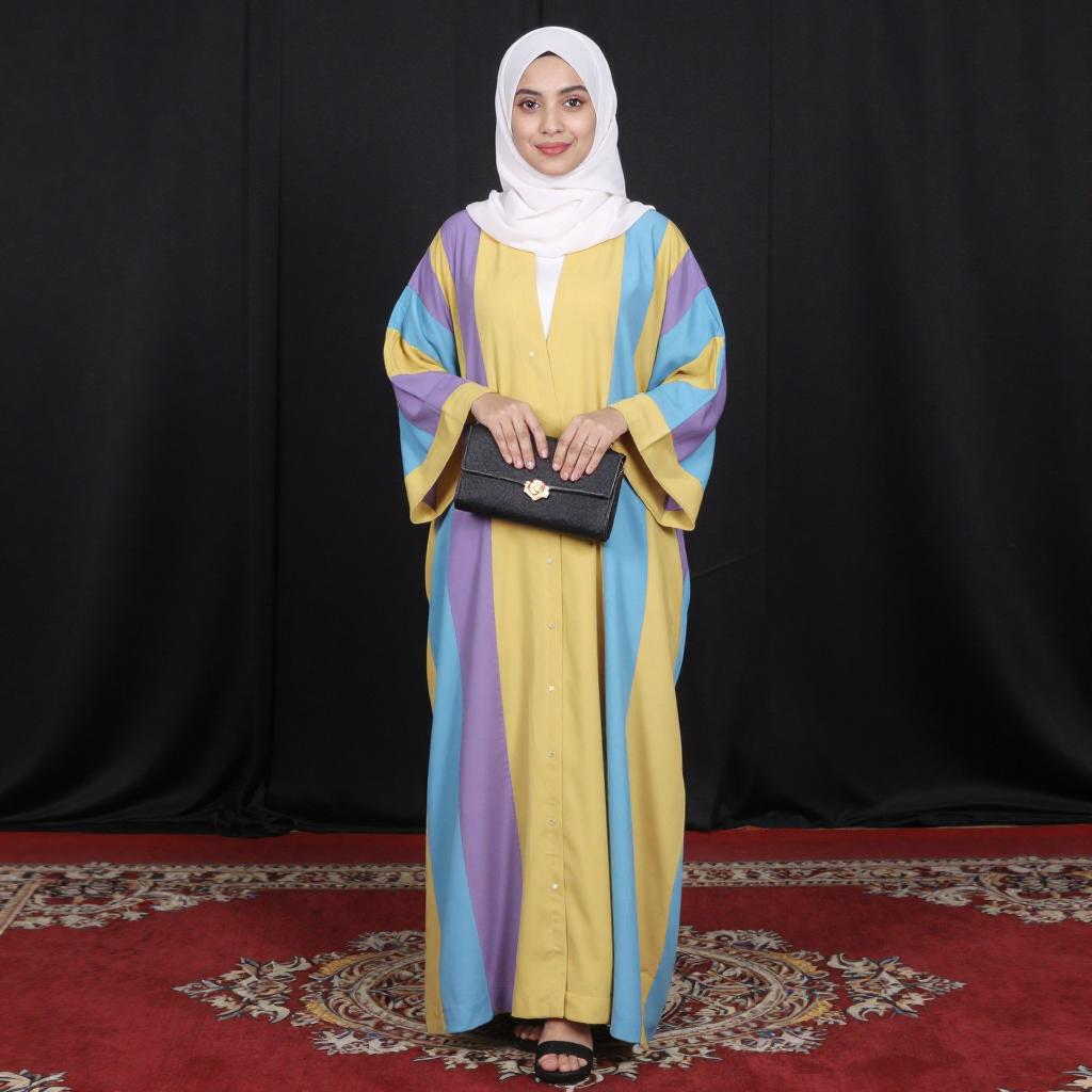 Photograph of a young woman standing on a red carpet with a patterned floor. She wears a white hijab, a long, colorful robe with yellow, purple, and blue stripes, and holds a black clutch. She stands in front of black curtains, smiling slightly.