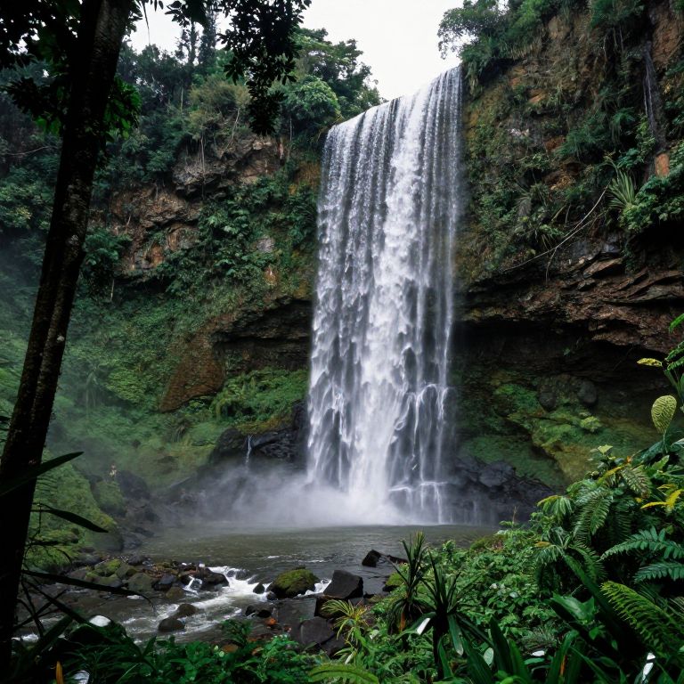 Photograph of a wide, multi-tiered waterfall cascading into a green, misty pool, surrounded by lush, green trees under a bright blue