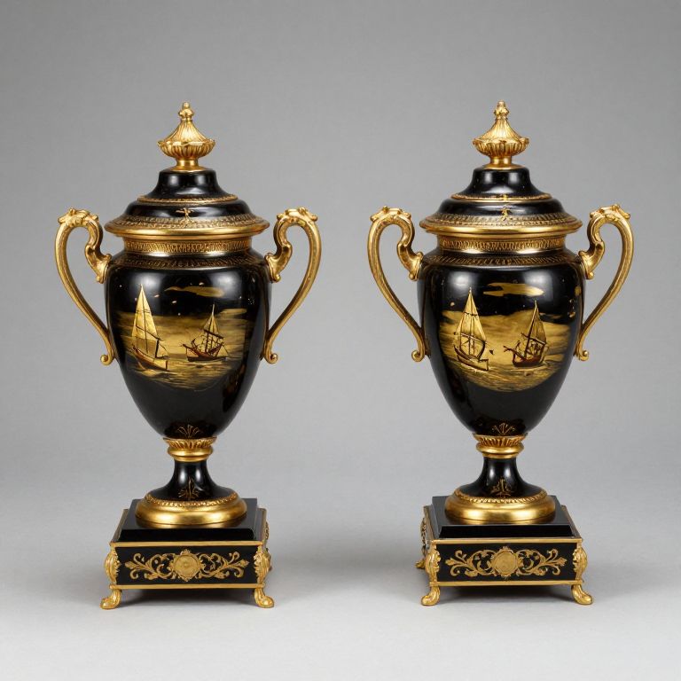 Photograph of two ornate, black and gold porcelain jardinières with ship motifs, gold handles, lids, and bases, standing against a