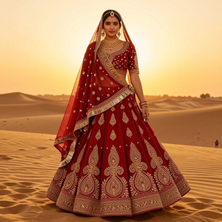 A regal lehenga choli with silk dupatta and hand-embroidered paisley patterns, depicted during a traditional ceremony in Rajasthan, golden desert backdrop, warm sunset, rich cultural context, high realism.