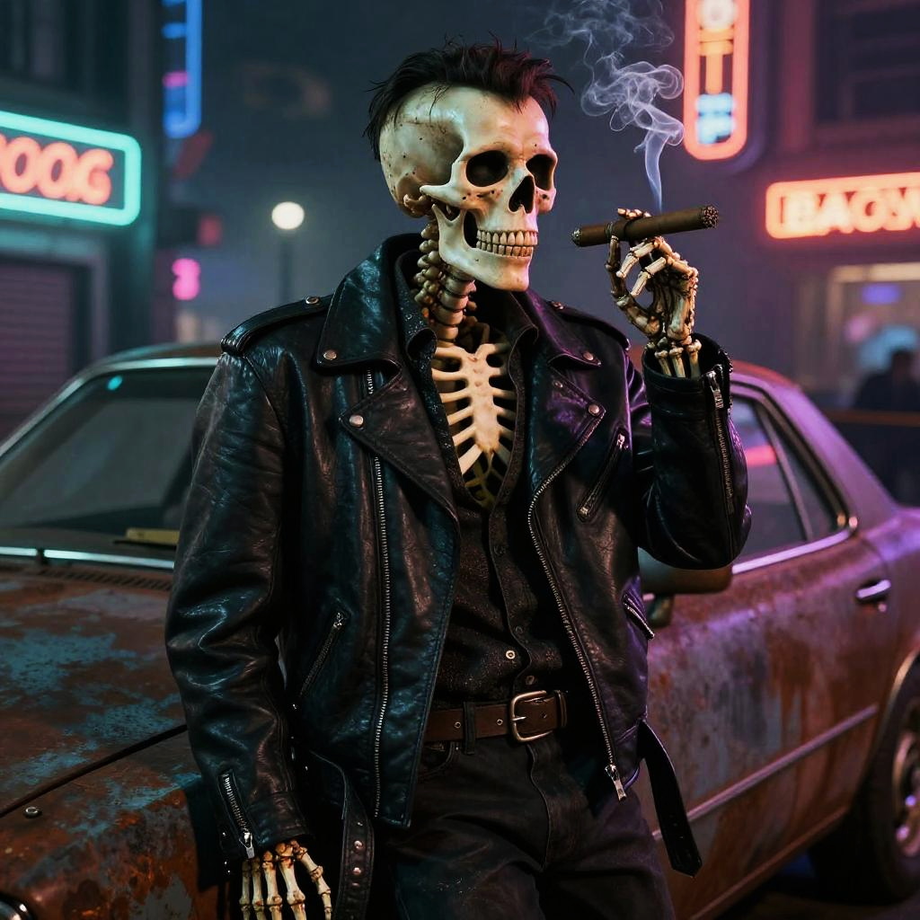 Skeleton smoking a cigar dressed in a classic leather jacket leaning against a rusty car in a dystopian cityscape, neon signs flickering in the background, heavy shadows and vibrant colors mixing in a cyberpunk aesthetic.
