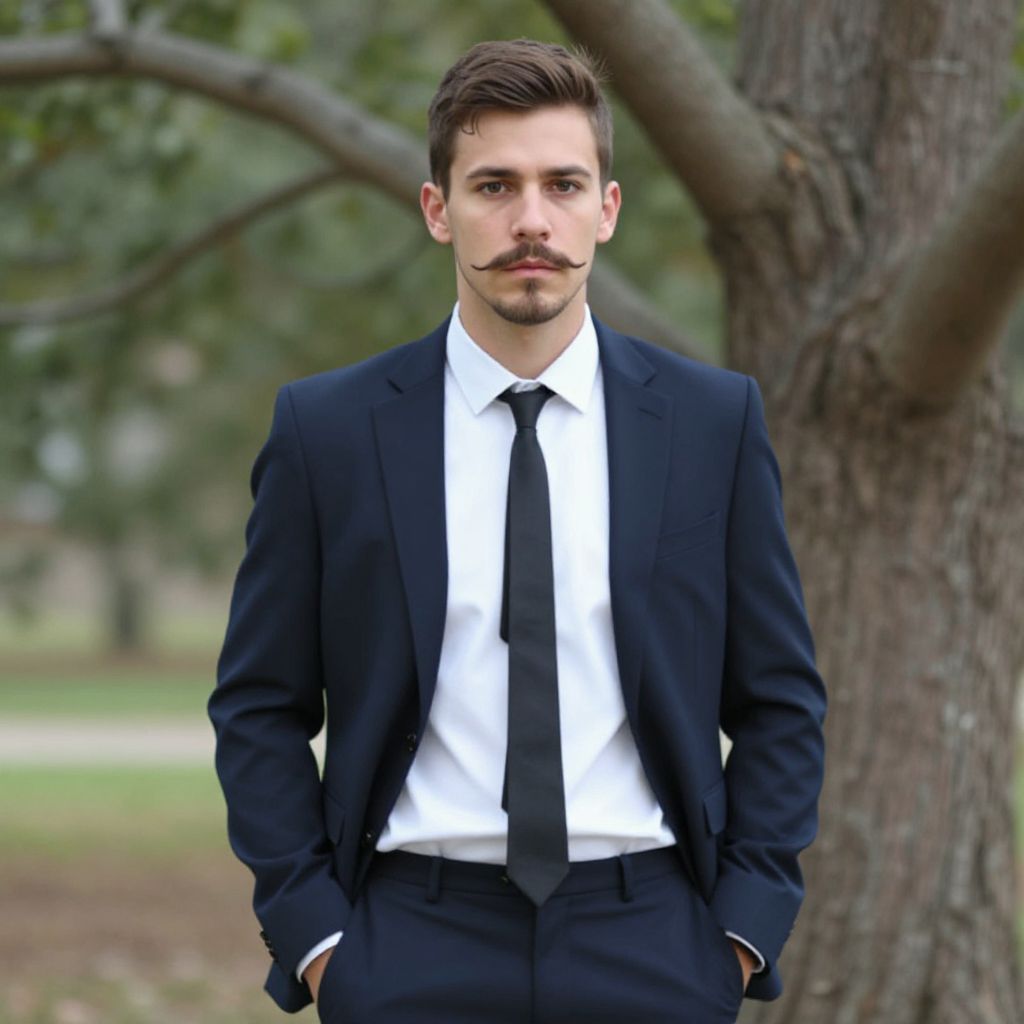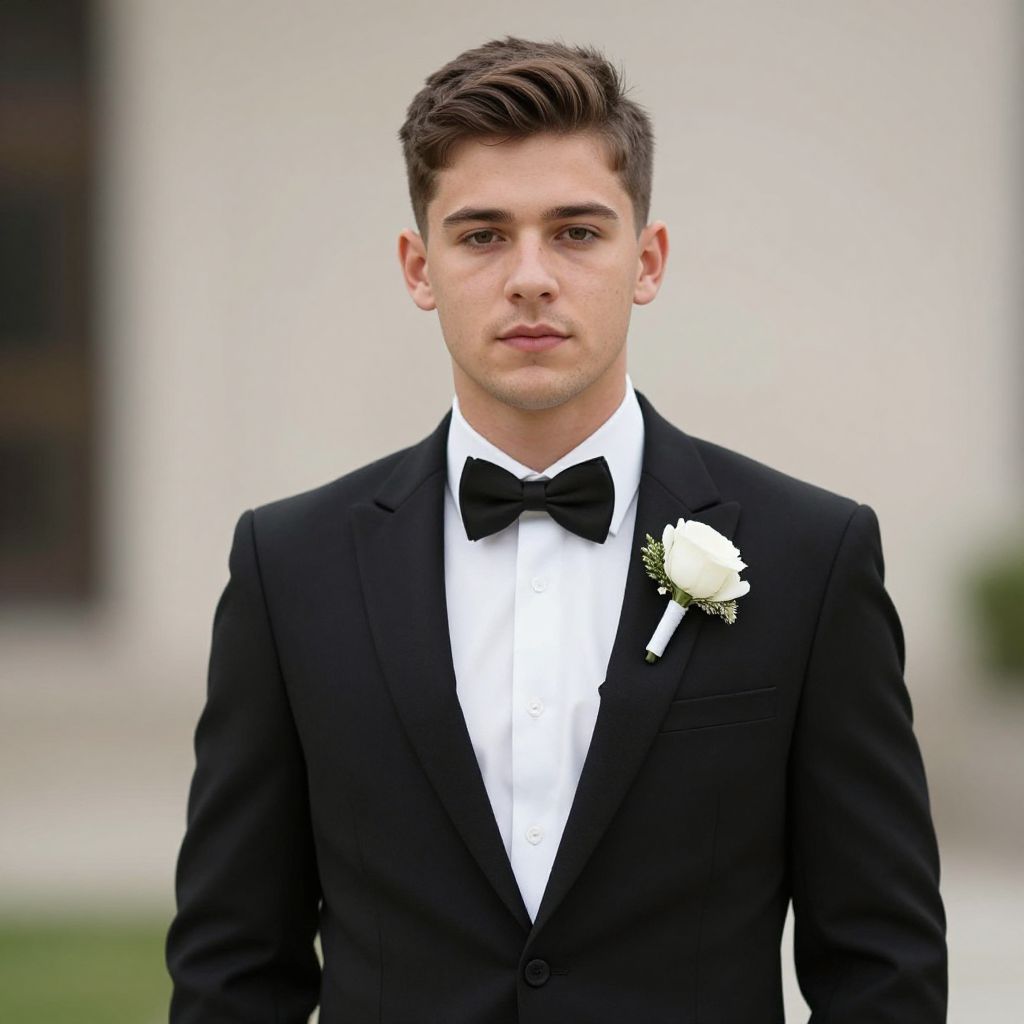 Groom wedding costume, 1boy, male focus, solo, facial hair, formal, blurry background, suit, black pants, shirt, pants, own hands together, jacket, blurry, flower, white shirt, short hair, outdoors, looking at viewer, bowtie, black jacket, realistic
