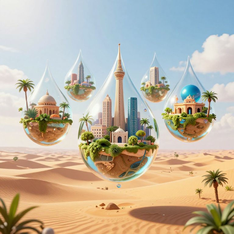 A surreal 3D-rendered scene depicts a fantastical city of floating water droplets suspended above a vast desert landscape, each droplet encapsulating a vibrant miniature world with lush greenery, palm trees, and architectural marvels, creating a dreamlike contrast between arid sand dunes and thriving ecosystems under a bright, ethereal sky.