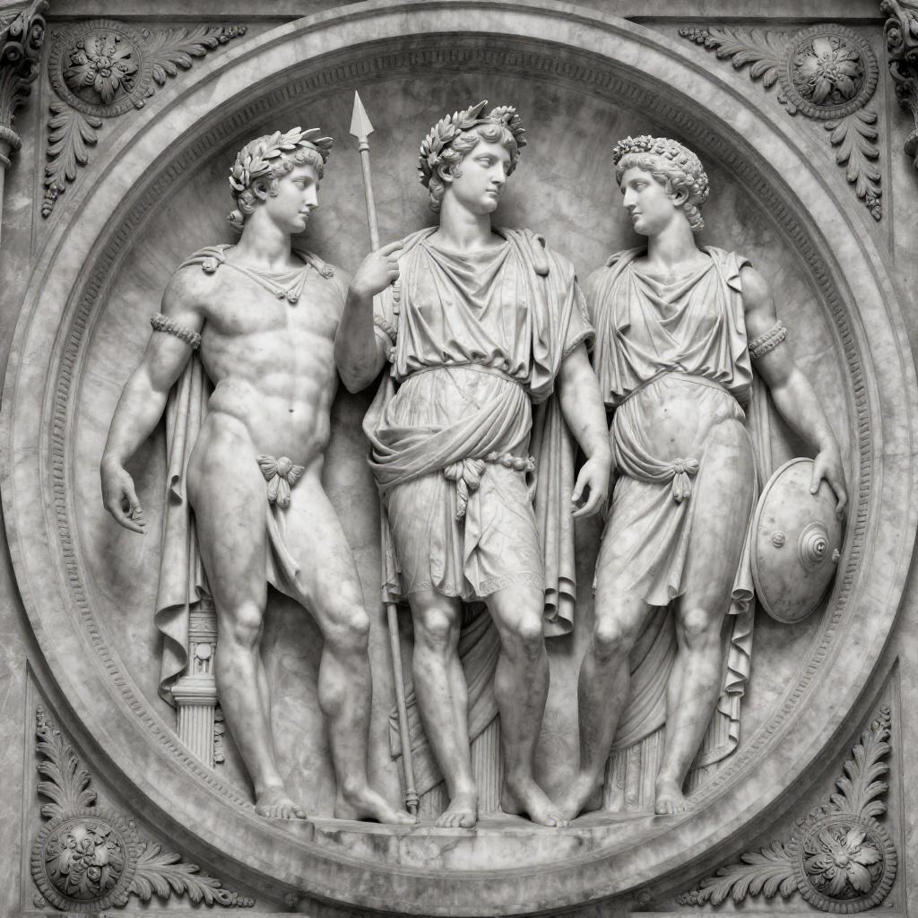 Photograph, classical sculpture, three male figures, ancient Greek style, white marble, muscular physiques, detailed togas, laurel wreaths, spear, shield, standing pose, circular frame, ornate background, high contrast, black and white, architectural detail, historical art, relief, ancient Roman influence, dramatic lighting, three-dimensional, decorative elements, mythological theme, sculptural group, ancient civilization, art history, detailed textures, high relief, classical architecture, grandiose design, symbolic representation, ancient mythology, cultural heritage