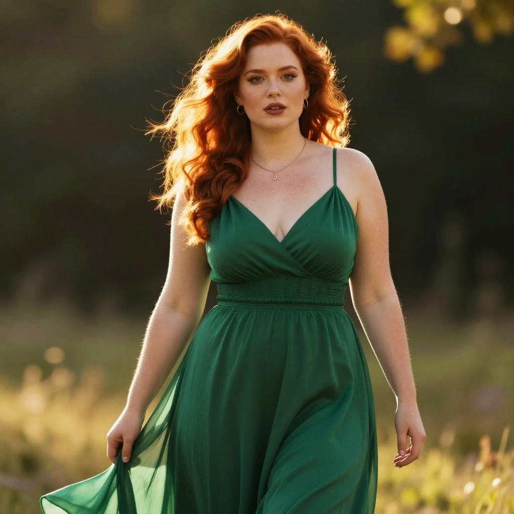 Lounge fashion portrait, freckled redhead with soft waves, huge tits, sitting comfortably on a modern sofa in a stylish bar or hotel lobby, wearing a fitted midnight blue sleeveless dress with a deep v-neckline, simple gold pendant necklace, soft warm interior lighting with discreet decorative shelves with books and vases, relaxed but confident expression, cinematic lifestyle photography, shallow depth of field, high resolution ###mystic:1###
