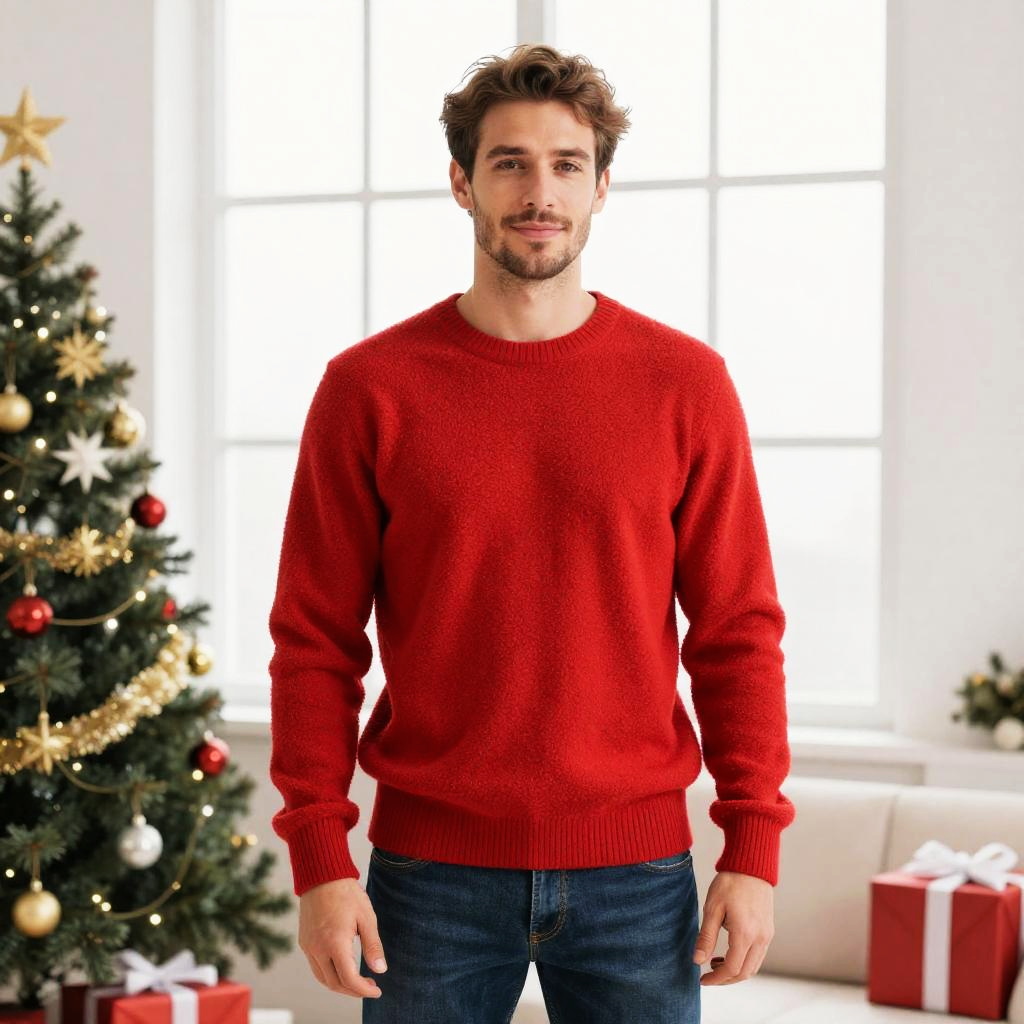 Fleece Navidad Sweater Costume, man in a red sweater standing in front of a window