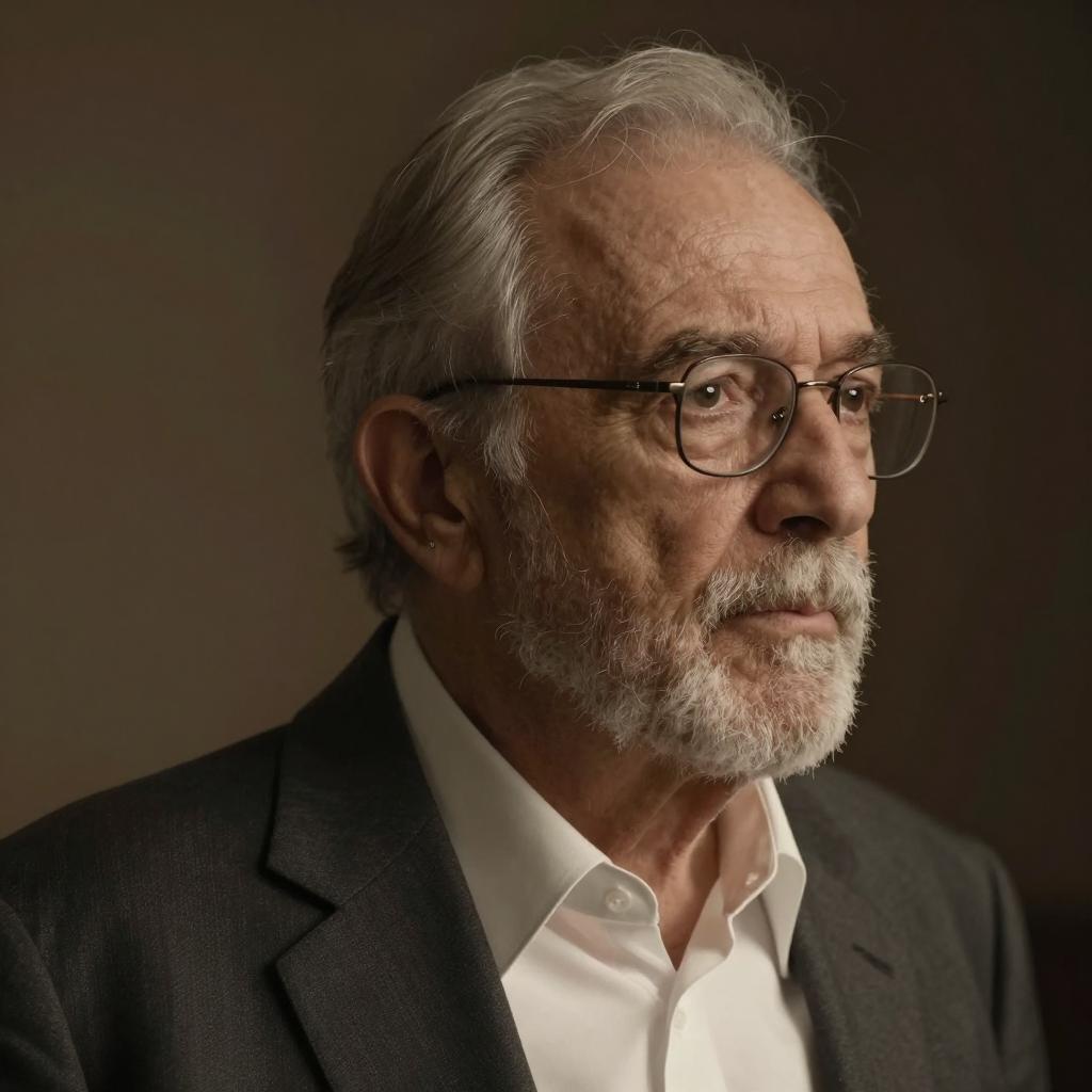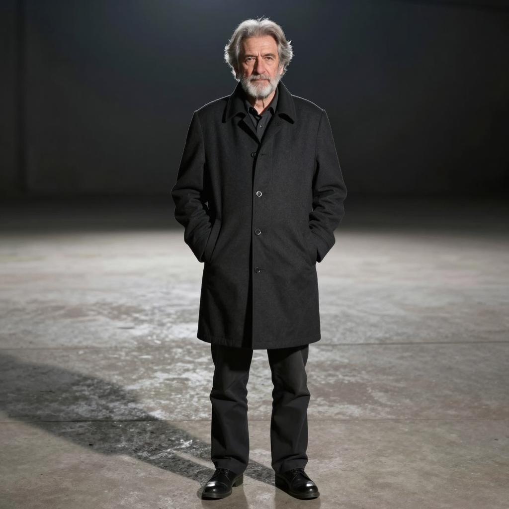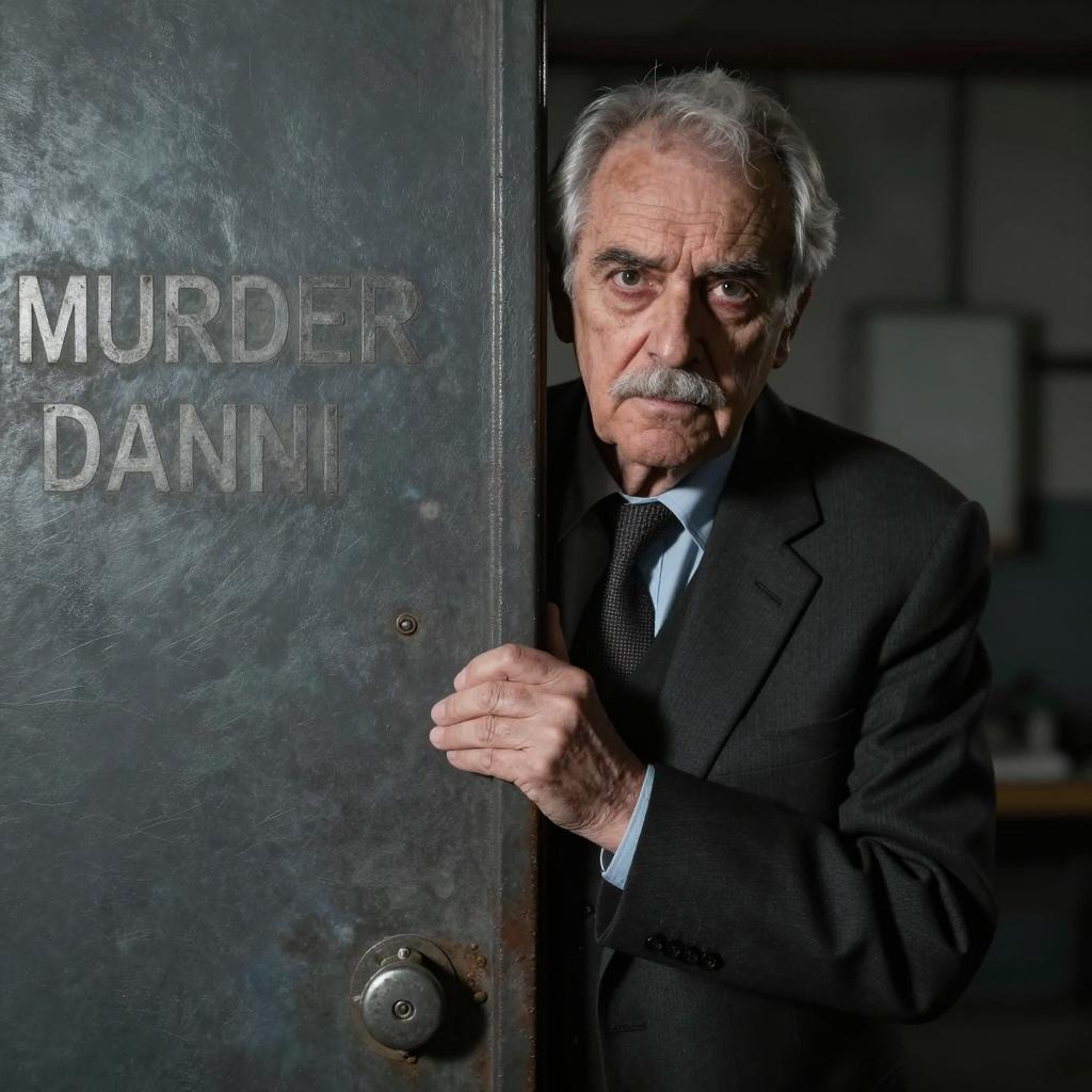 Old man with gray hair and mustache peeks through a metal door with "MURDER DANNI" engraved on it. Wearing a dark suit and tie, he grips the door frame with his right hand. Dim, industrial setting.