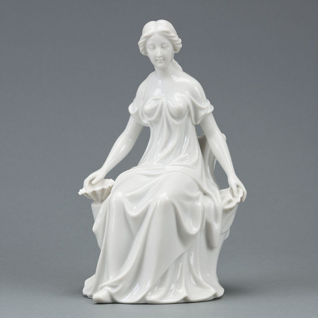 Elegant Meissen porcelain figurine titled \"Good Mother,\" crafted in a pristine white finish, depicts a seated woman in a flowing gown, gracefully holding a shell in her left hand while draping her right arm over the fabric, exuding timeless elegance against a neutral backdrop.