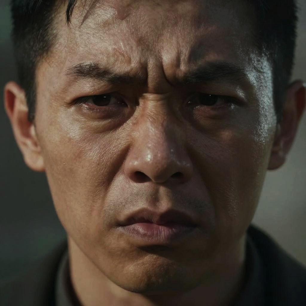 Contorted face expressing intense emotion, hyper-realistic style, detailed wrinkles and shadows, dramatic lighting highlighting twisted features, cinematic close-up portrait