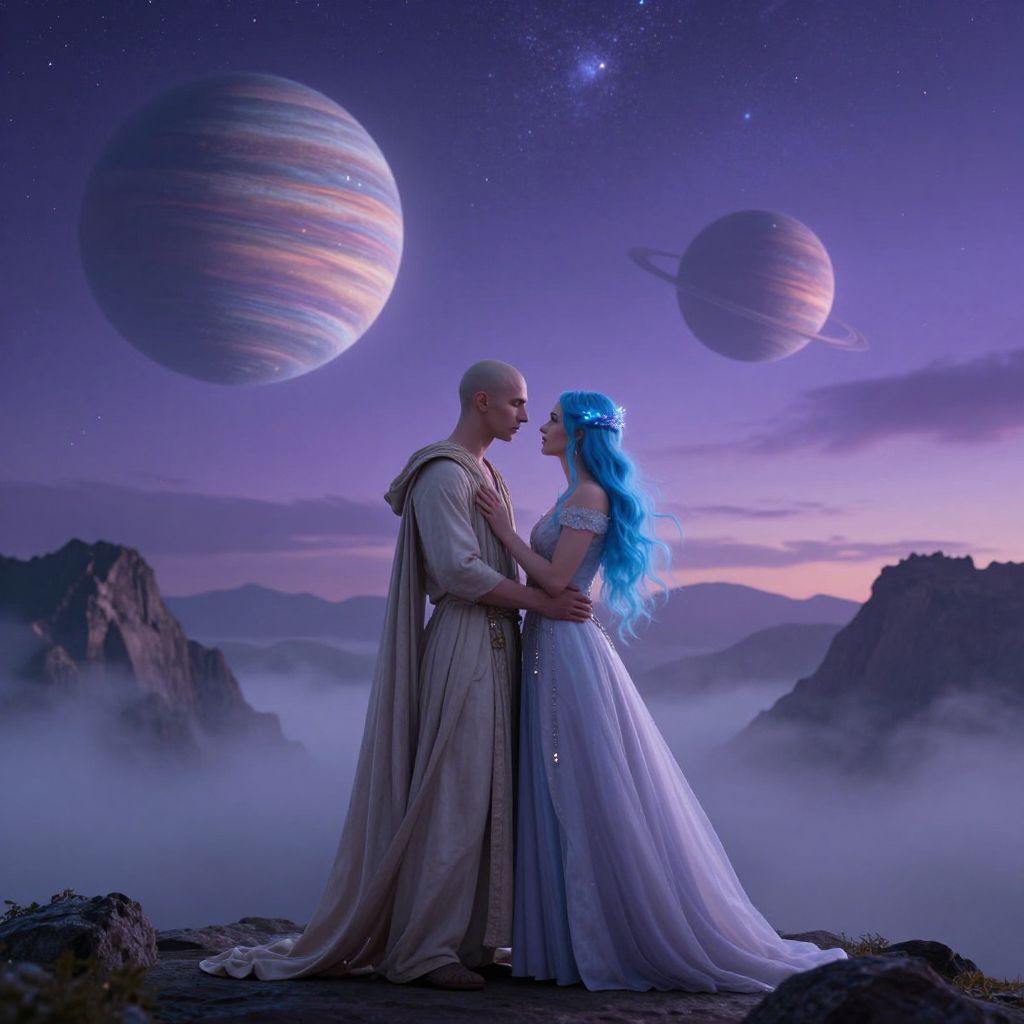 In a surreal twilight realm where two luminous planets hover in a purple-hued sky, a bald man in a flowing robe and a woman with ethereal blue hair stand in tender embrace, their gaze locked in a timeless, otherworldly connection amidst misty mountains and celestial wonder.