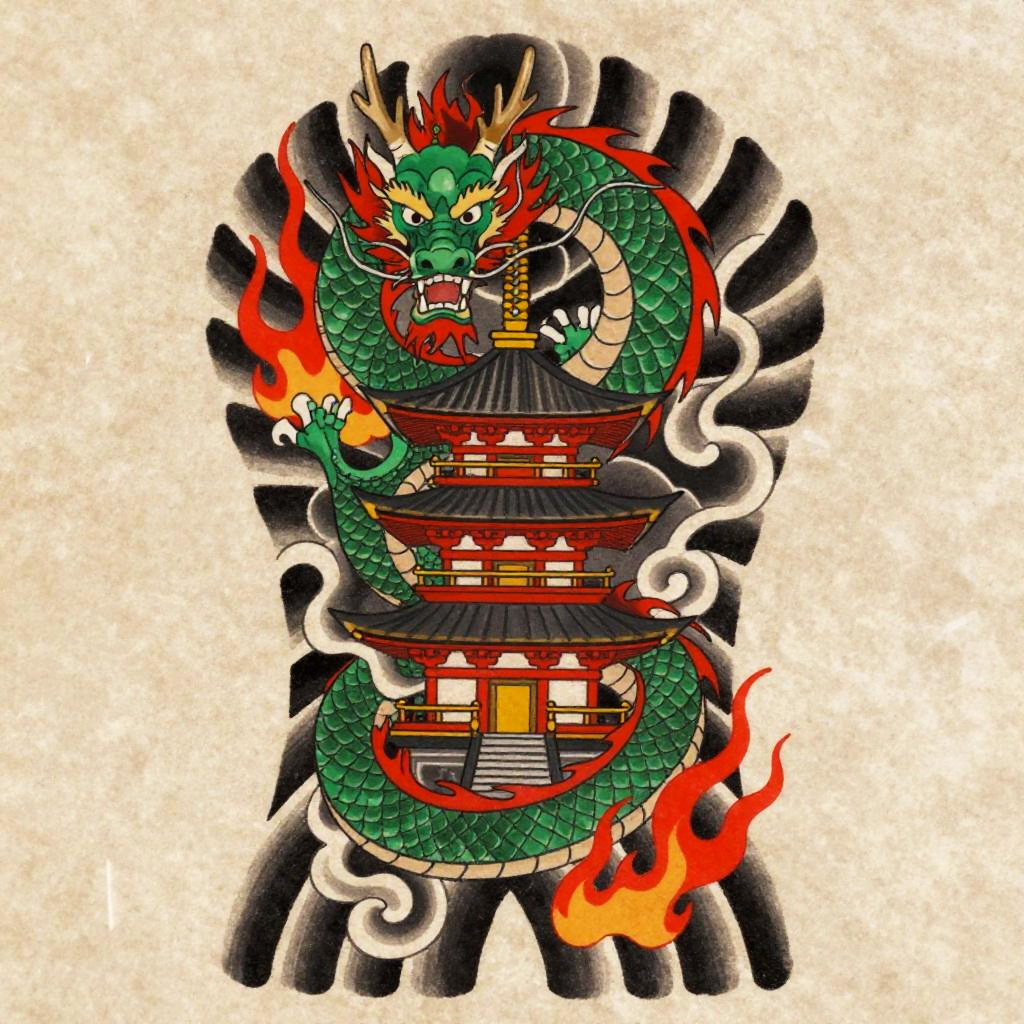 Traditional style anime tattoo illustrating a dragon coiling around a pagoda, fierce expression, heavy black inks combined with bright reds and greens, infused with smoke and fire elements in Japanese style.