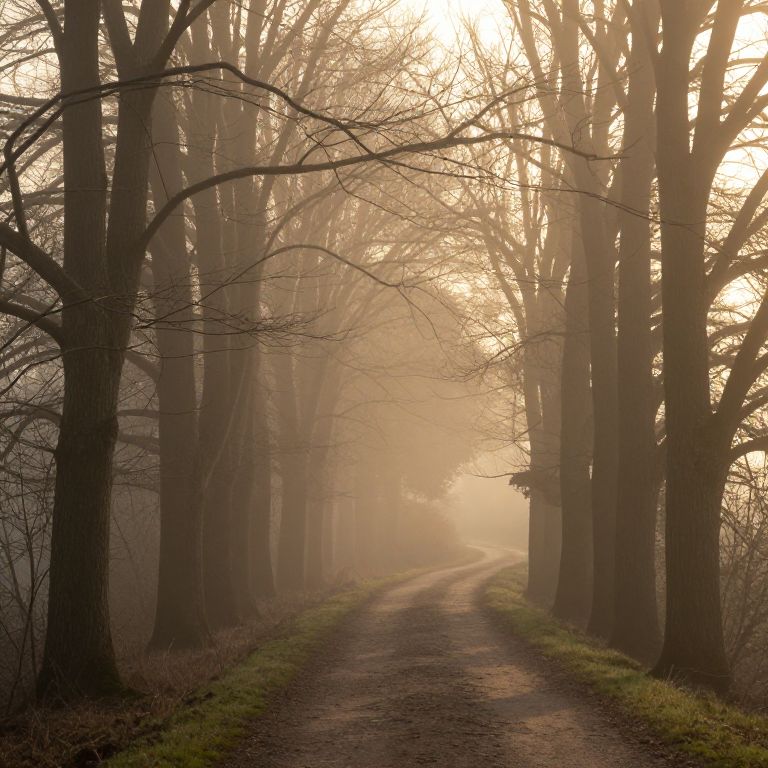 Mist-laden trees stand solemnly along a winding dirt path, their bare branches reaching toward a diffused golden light that pierces through the ethereal haze, creating a serene yet enigmatic woodland scene.
