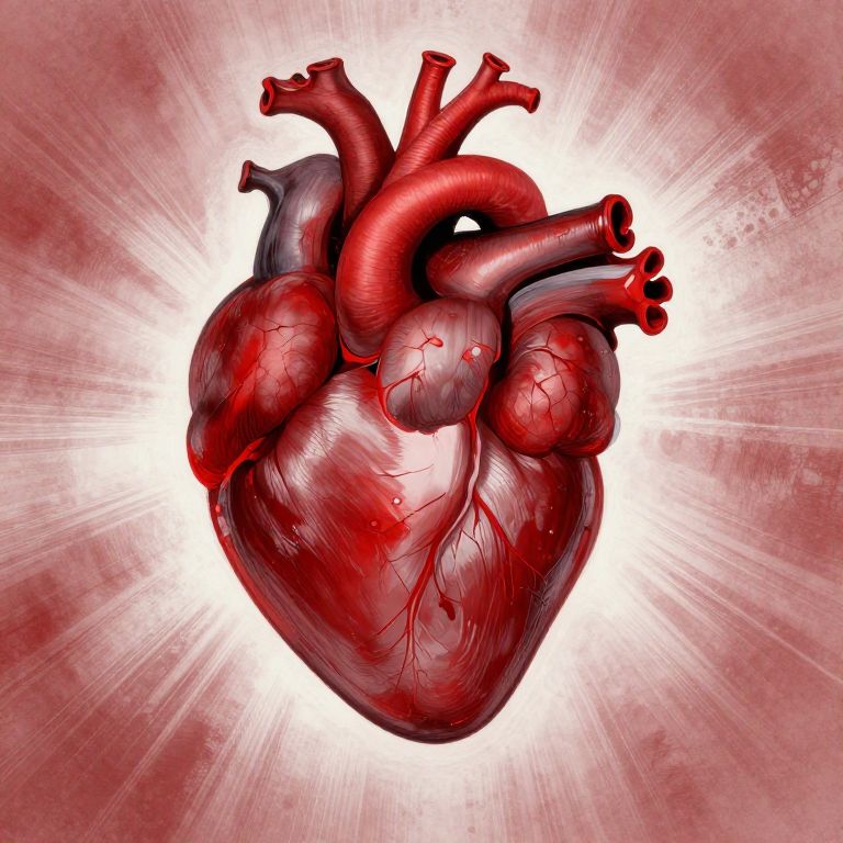 Digital illustration of a detailed, red, blood-filled human heart with visible veins and arteries, set against a radiant white and red textured background.