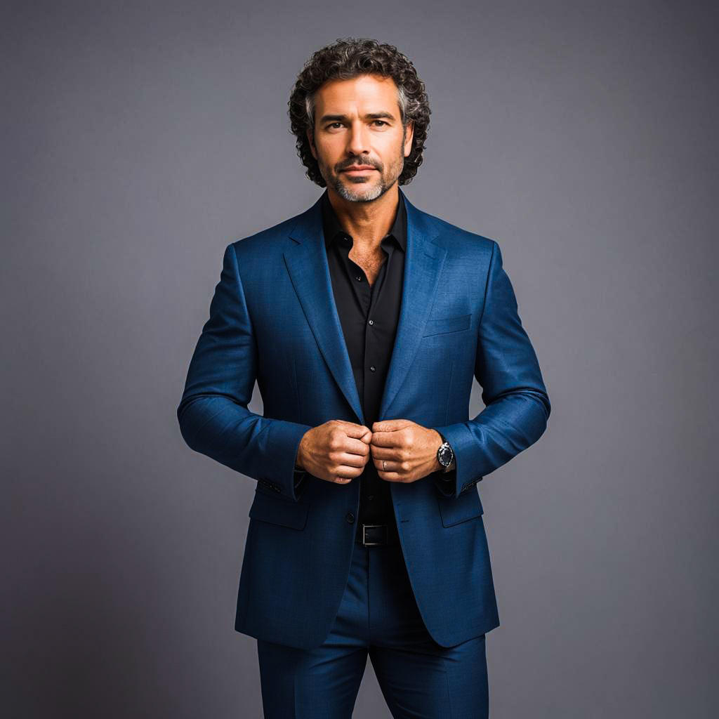 Your answer: Photo-shoot, confident middle-aged man, curly dark hair, muscular build, 80s outfit men, corporate style, Modern Mesh Gradient Fabric studio background