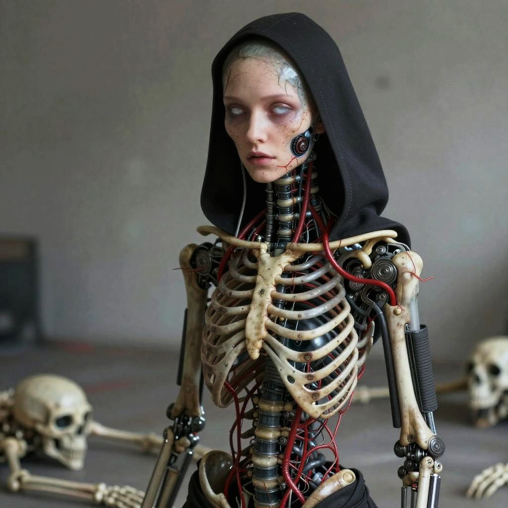 1girl, jane_noexist, half face gone, hnsrdlf style intricate biomechanical detail, (blood vessels connected to tubes), (biomechanical vertebra attaching to chest), ((biomechanical cervial attaching to neck))((masterpiece), (best quality), (ultra-detailed), solo, hood, black gloves, long sleeves, fantasy, sci-fi, horror, aliens, white eyesrealistic, (skeletons on the floor:0.3)masterpiece, award-winning photo, analog style
