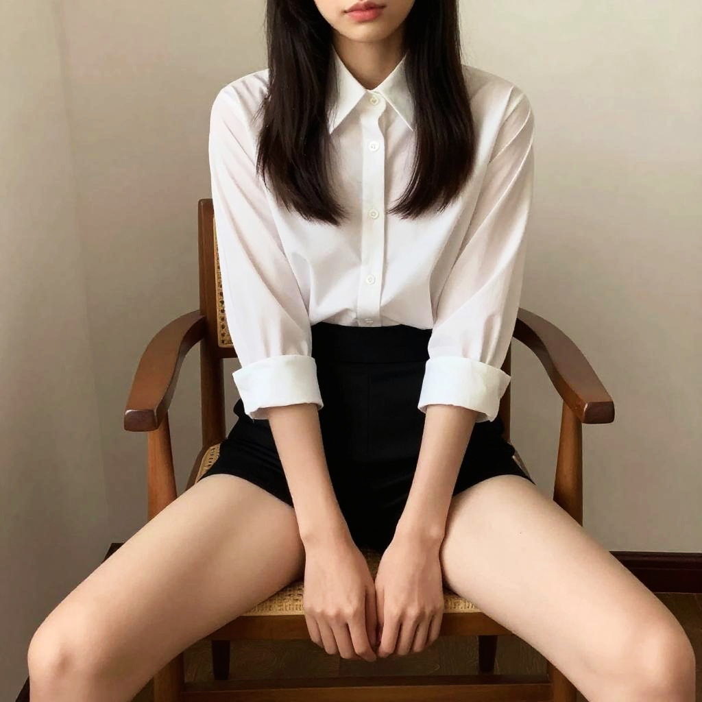 Realistic photo.Tall 24-year-old woman sitting on a wooden chair, chic blouse and skirt, long straight hair, legs spread, hands clasped between legs, detailed clothing, realistic, evening lighting. realistic photo