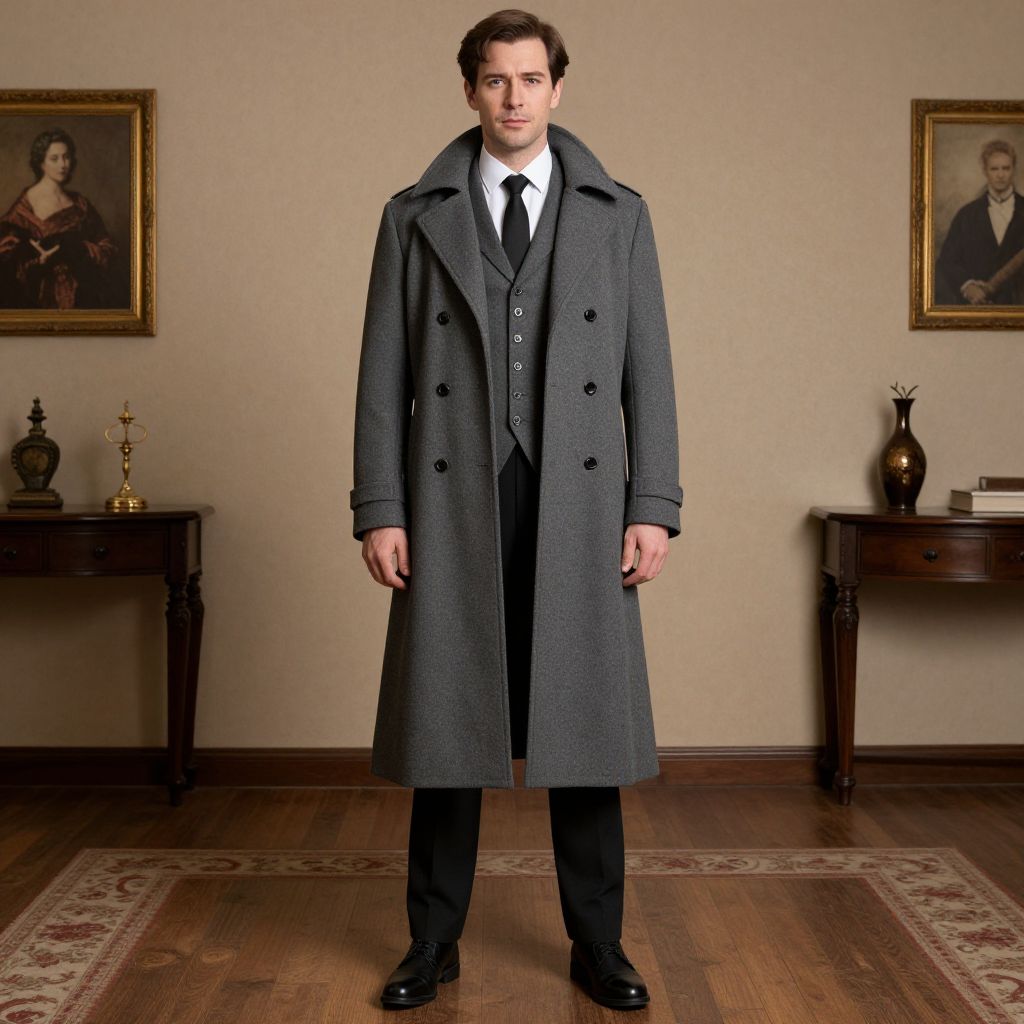 Photograph of a white man with short brown hair, standing in a formal room. He wears a dark gray, double-breasted overcoat, a white dress shirt, and a black tie, with black dress pants and polished black shoes. The room has beige walls, wooden floors, and a patterned rug. Two dark wooden tables flank the background, each holding a small, ornate lamp and a framed portrait of a woman in vintage clothing. The man's expression is neutral, and he stands centrally, facing the camera.