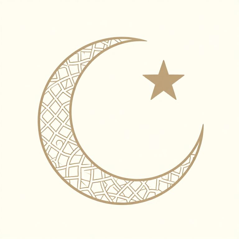 Islamic AI image prompt: A minimalist digital illustration of a crescent moon and star, rendered through AI art, with subtle interlacing patterns inspired by Islamic geometry, evoking balance, harmony, and the infinite nature of divine wisdom.