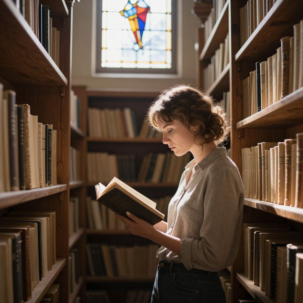 Woman engrossed in reading a book amidst rows of wooden shelves filled with ancient texts, illuminated by soft sunlight streaming through a stained-glass window above.