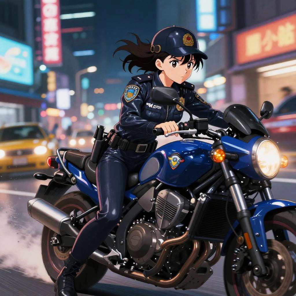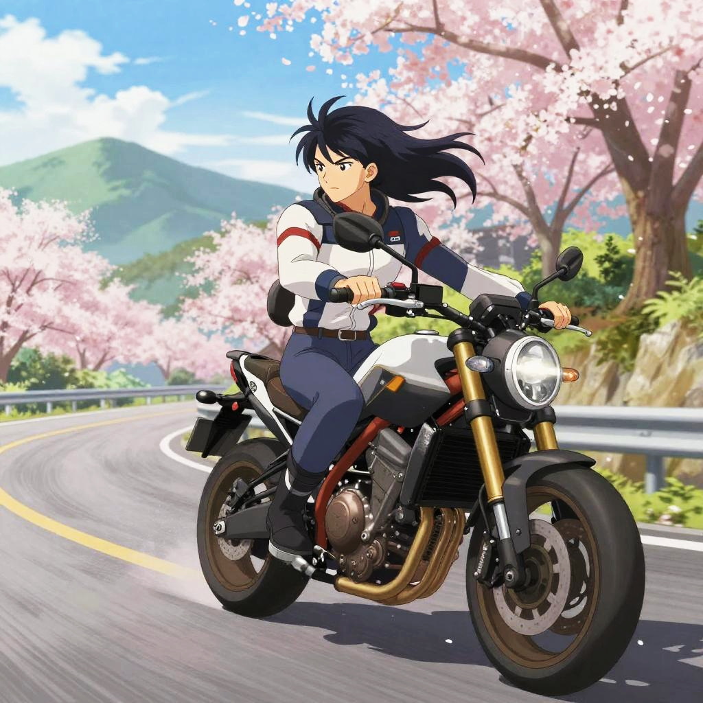 Anime biking adventure on winding mountain roads, a determined character with flowing hair and striking outfit riding a powerful motorbike against a scenic backdrop of cherry blossoms