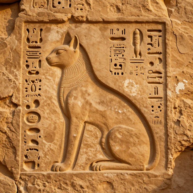 Cat hieroglyph carved into ancient sandstone, glowing softly under golden desert sunlight, intricate Egyptian symbols surrounding the mystical feline figure, atmospheric and detailed, evoking a sense of ancient mystery and reverence, warm tones and textured stone.