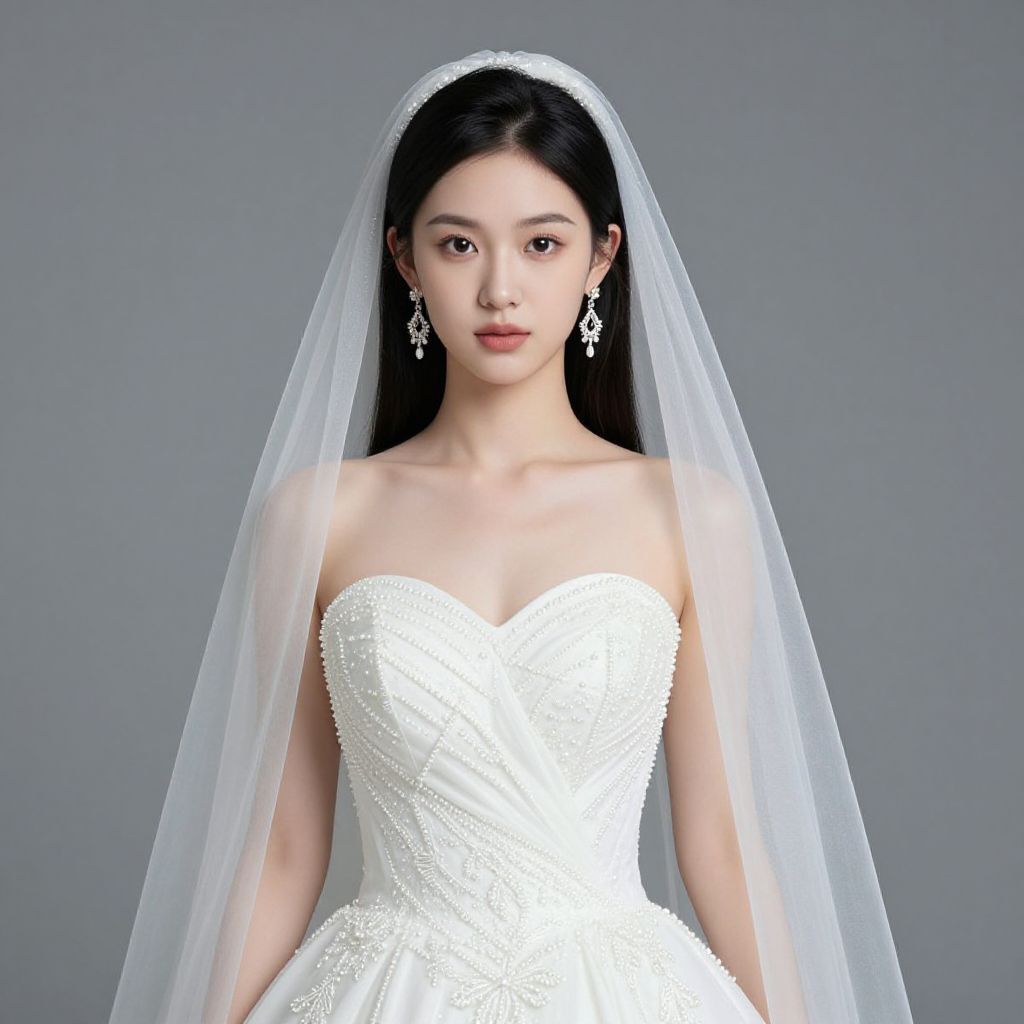 Fancy gowns wedding costume, 1girl, dress, solo, wedding dress, veil, jewelry, earrings, black hair, realistic, looking at viewer, bridal veil, white dress, bare shoulders, breasts, long hair
