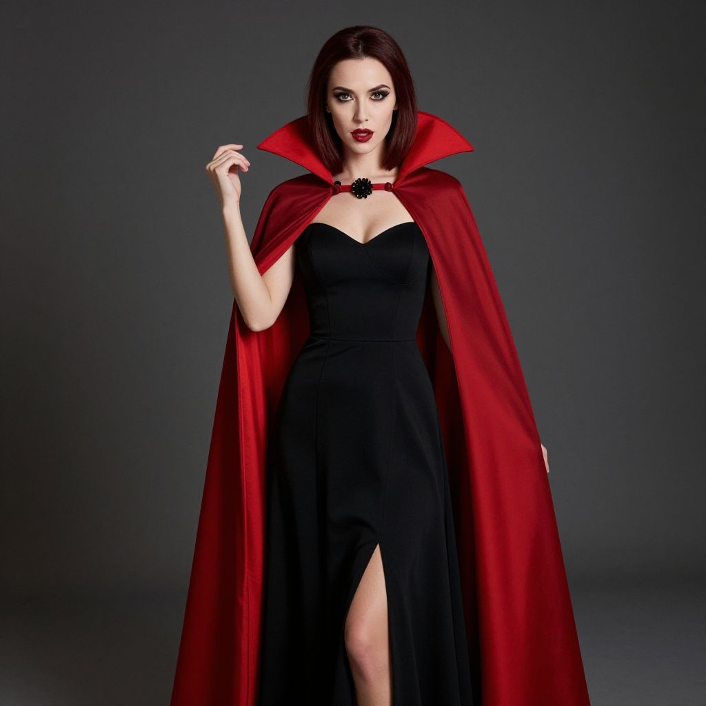 "Beautiful Vampire Costume, woman in a black dress with a red cape"