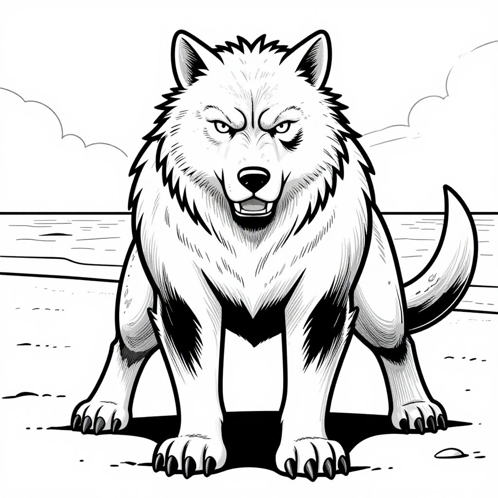Black and white digital drawing of a large, fierce wolf standing on all fours with a confident, slightly menacing expression. The wolf has thick, textured fur with detailed shading, sharp claws, and a bushy tail. Its eyes are focused and intense, with a slight snarl revealing sharp teeth. The background features minimalist, horizontal lines suggesting a horizon, and some cloud-like shapes in the upper part. The overall style is bold and stylized, with strong, clean lines and high contrast, evoking a sense of power and wildness.