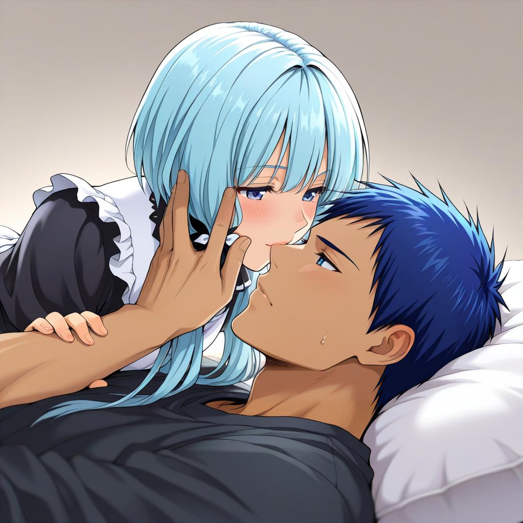 Digital anime-style illustration showing an intimate moment between a dark-skinned male with short blue hair and blue eyes, and a female character with long light blue hair wearing a black and white maid outfit. The male character lies on a pillow while the female leans in closely, highlighting emotional connection. The detailed art features shading and a soft background gradient.