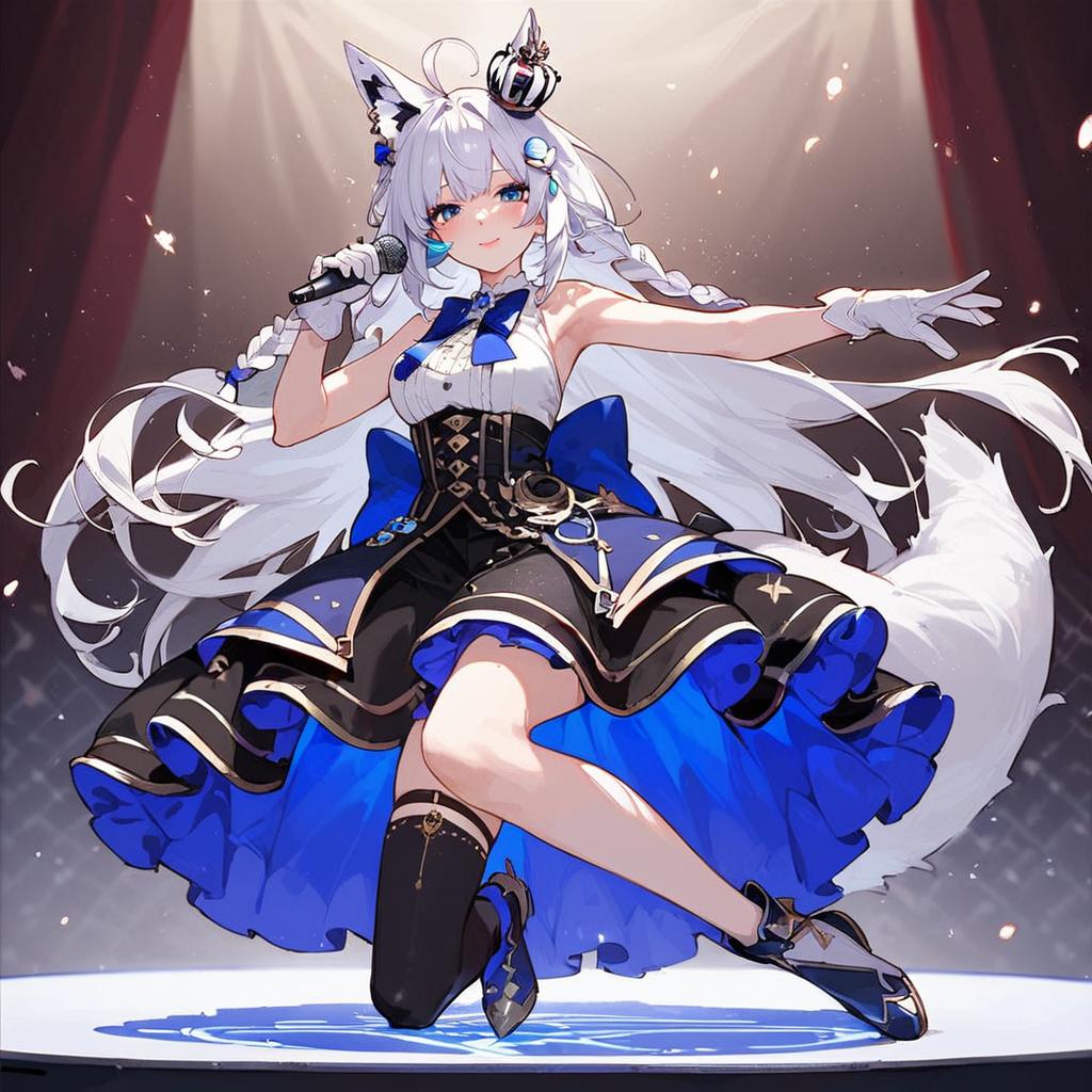 Score_9 source_anime, 1girl, solo, full body, stage, concert, dynamic pose, fubukiidol, twin braids, hololive idol uniform, sleeveless, layered skirt, white gloves, mini crown, blue bowtie, bow, asymmetrical legwear, white hair, single side braid, ahoge, piercing, fox tail, pentagram, holding microphone