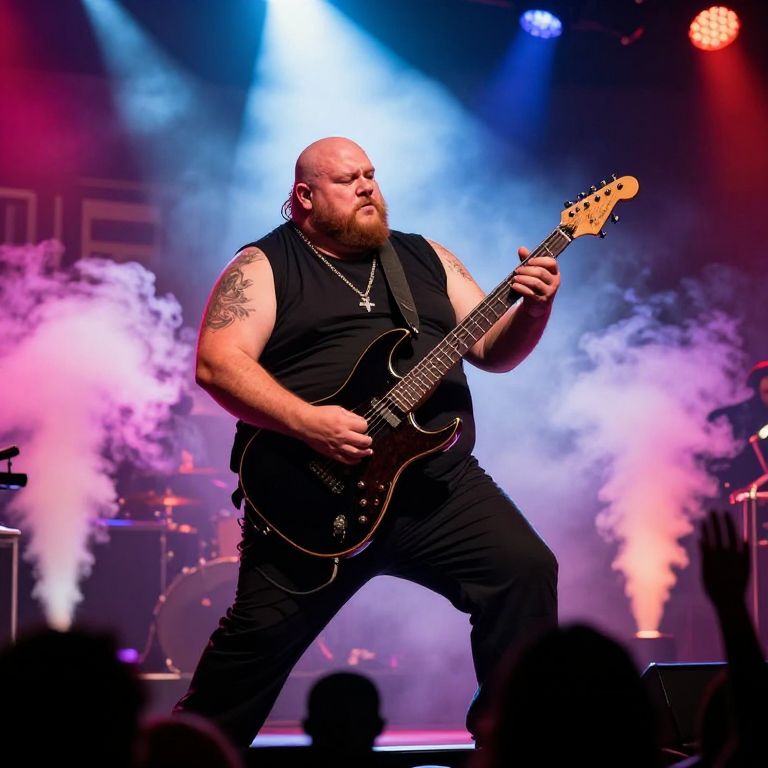 Photograph of a bald, bearded man with a muscular build, playing an electric guitar on stage. He wears a black sleeveless shirt, black pants, and a necklace. His right arm showcases a tattoo. Bright stage lights, including blue, pink, and white, create a colorful, smoky atmosphere. In the background, a drummer is partially visible behind a drum set. The audience, silhouetted in the foreground, raises hands. The man's intense expression and dynamic posture suggest a powerful performance. The overall scene exudes energy and excitement typical of a live rock concert.