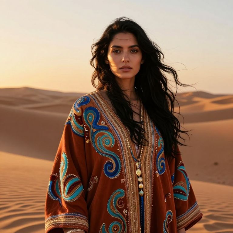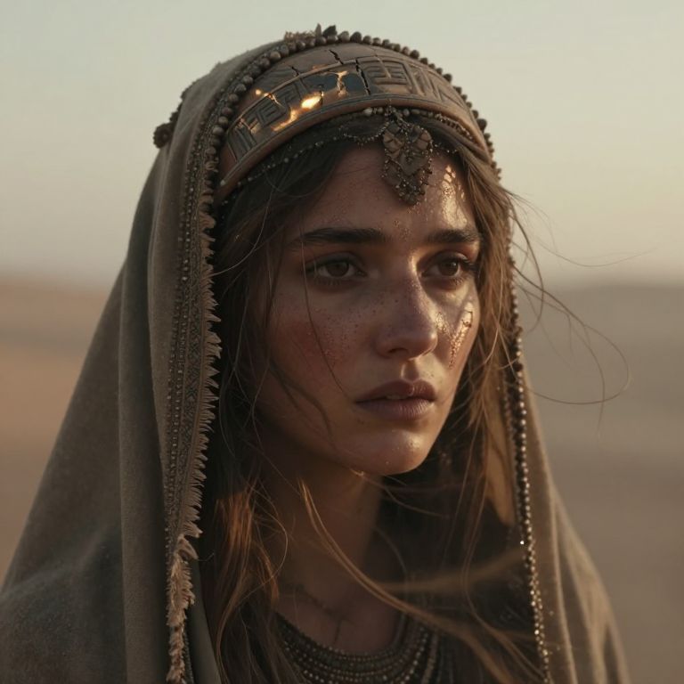A stark, intimate close-up of the desert princess's face, her sun-scorched skin bearing a faint, faded golden sheen, framed by tangled strands of windblown, sand-encrusted hair, Her eyes, weary yet piercing, catch the muted glow of a dying desert dawn—a desaturated blend of amber and washed-out pastels, hinting at both defiance and despair, Fine grains of sand cling to the sweat on her weathered brow, forming a raw, gritty texture that speaks of survival against harsh odds, Her intricately beaded veil, frayed at the edges, barely conceals her face, its tarnished threads catching fleeting, dim beams of light slicing through the swirling, dust-choked air, The cracked, ancient headpiece rests unevenly on her forehead, its carvings worn and dulled, faintly pulsating with an eerie, forgotten glow that casts fractured shadows across her gaunt features, The atmosphere is bleak and foreboding—faint shafts of pale, anemic light struggle through a smothering ochre sky, illuminating her face with a ghostly, otherworldly pallor, Dust motes swirl erratically, catching the light in brief, haunting flashes that accentuate the desolation, Her expression is steadfast yet haunted, her slightly parted lips drawing in the dry, oppressive air, embodying quiet endurance in a landscape that feels as broken as she does