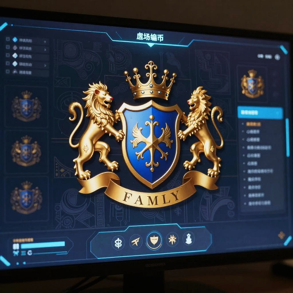 Family crest generator interface displayed on a glowing futuristic screen, intricate heraldic symbols and medieval motifs being designed, rich gold and deep blue colors, ornate shields and lions, a mix of digital technology and classic heraldry style.