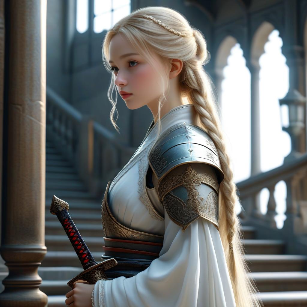 Portrait of a young woman with long blonde hair wearing detailed medieval-style armor, including shoulder plates and arm guards. She is dressed in a white garment with gold embellishments and a dark belt, standing in front of stone steps and classical columns, holding a sword with both hands.