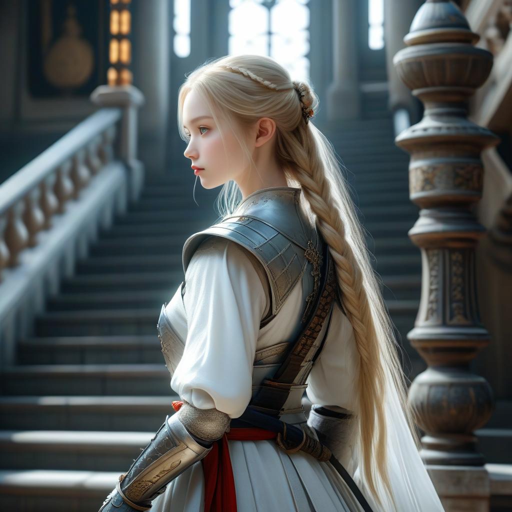 Evolution small chin, white transparent skin, a beautiful girl with blonde hair, baby face, she is young, narrow face, she wears a medieval European light armor, Japanese sword on her back, long straight hair, staircase of the palace, photorealistic, realistic photo, 8k, side profile